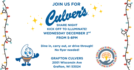 On Wednesday, December 2nd, Culver’s in Grafton will donate 15% of all gift card sales (all day long) and 15% of dine-in proceeds from 5–8 PM to support the Ozaukee Nonprofit Center!